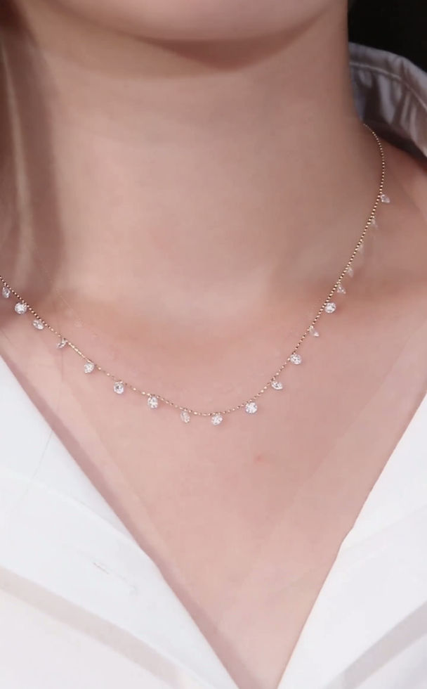 A refined station necklace featuring 20 round brilliant lab-grown diamonds, each 3.0 mm (0.10 ct), evenly spaced along a fine gold chain. Designed for effortless elegance, the diamonds float subtly along the neckline, creating continuous brilliance without visual heaviness. Crafted in 14K gold, this piece is finished with an adjustable slider clasp, allowing precise length control up to 18 inches for a perfect fit.